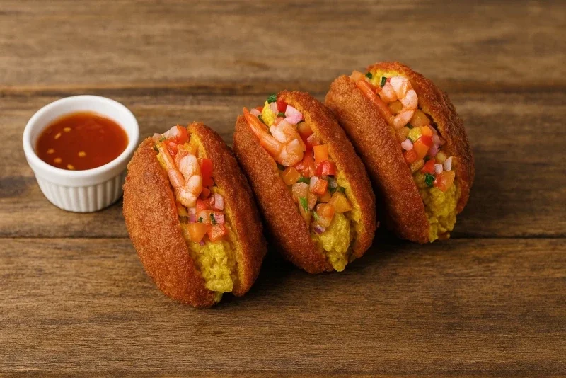 Mit Vatapá, Garnelen und scharfer Sauce füllen.