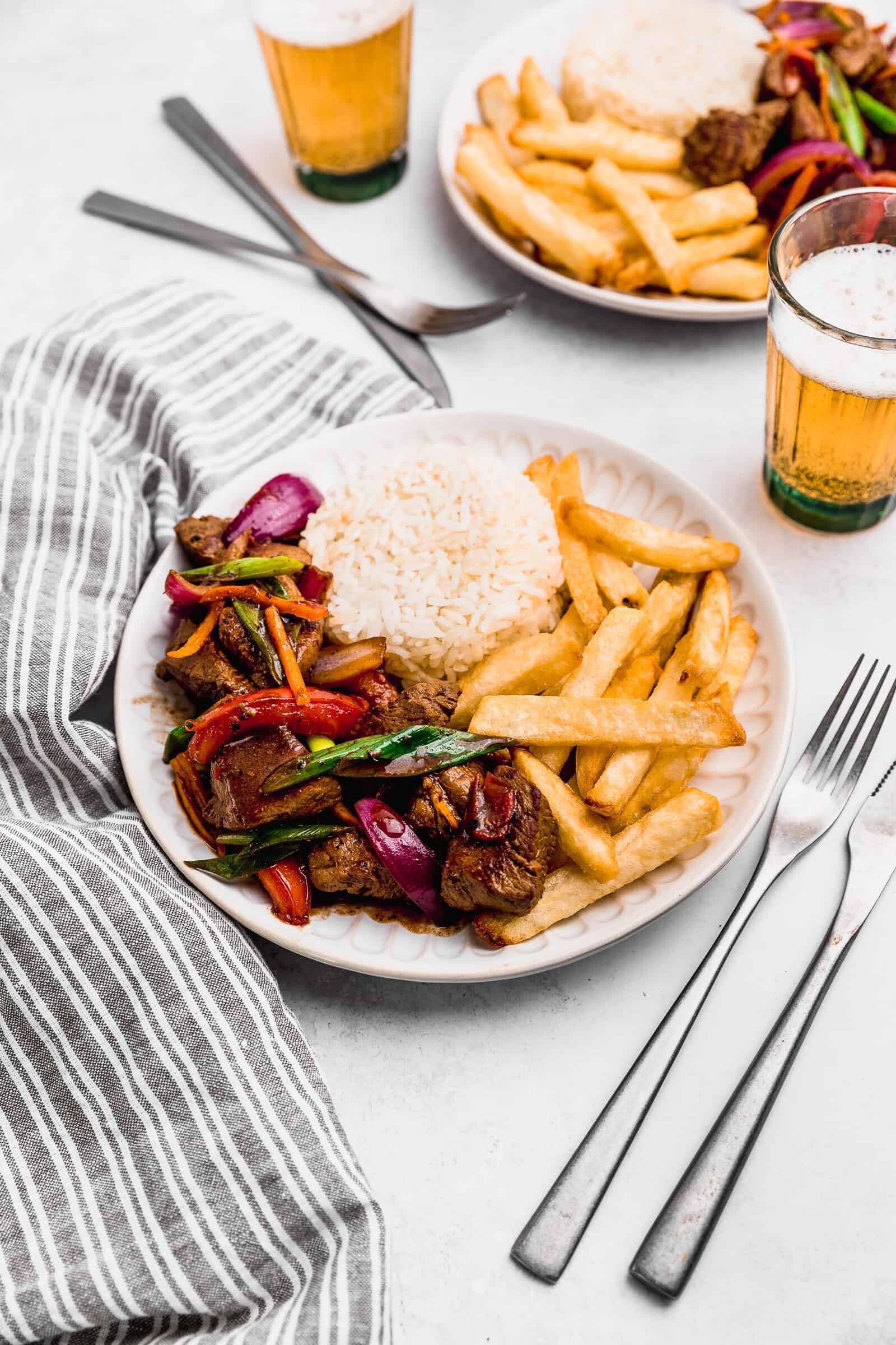 - Rindfleischstreifen mit Sojasauce, Essig, Knoblauch, Salz und Pfeffer 10–15 Minuten marinieren.